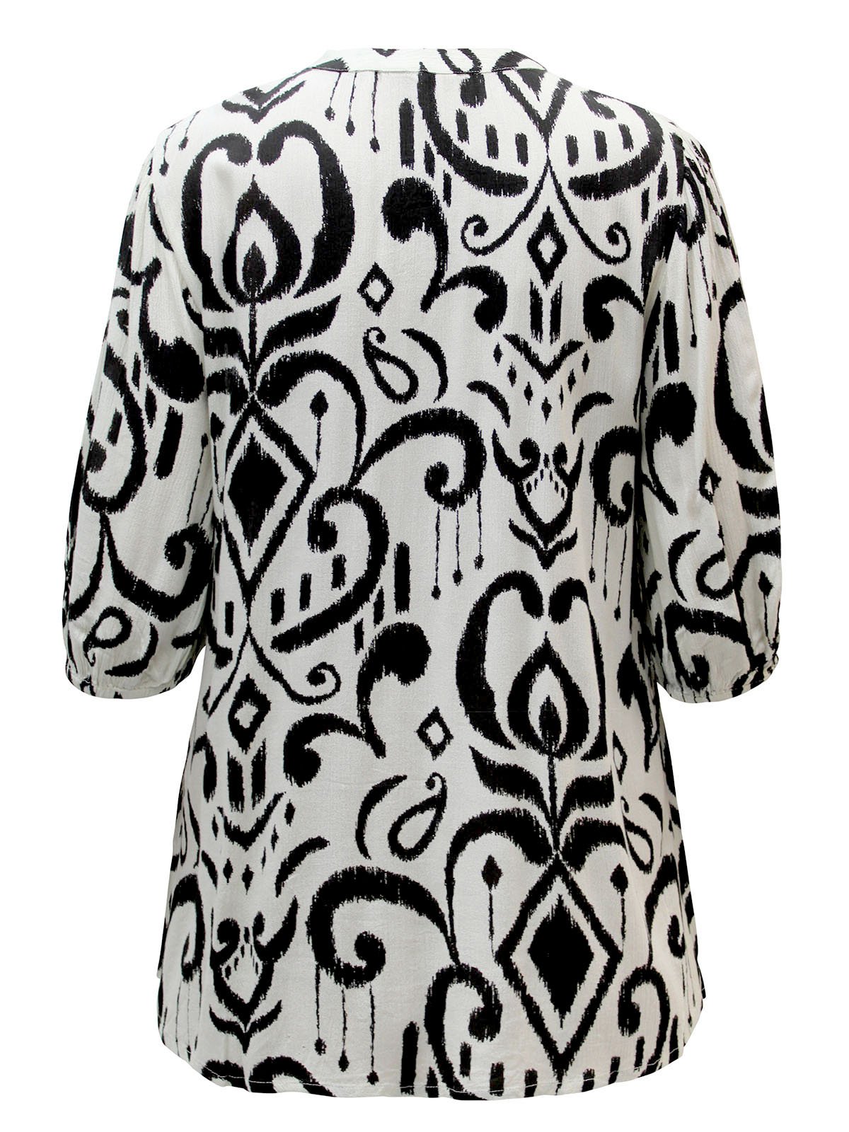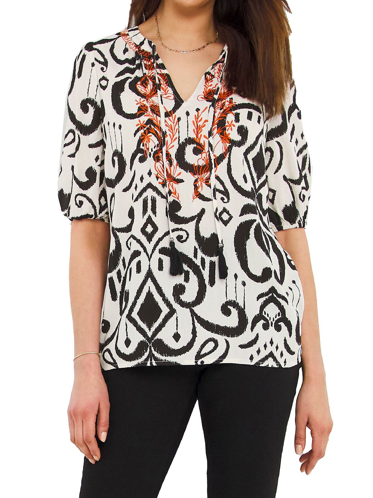 This printed woven top is designed with fit in mind. Featuring tassel ties to the neckline, contrast embroidery and half length sleeves with elasticated cuffs.