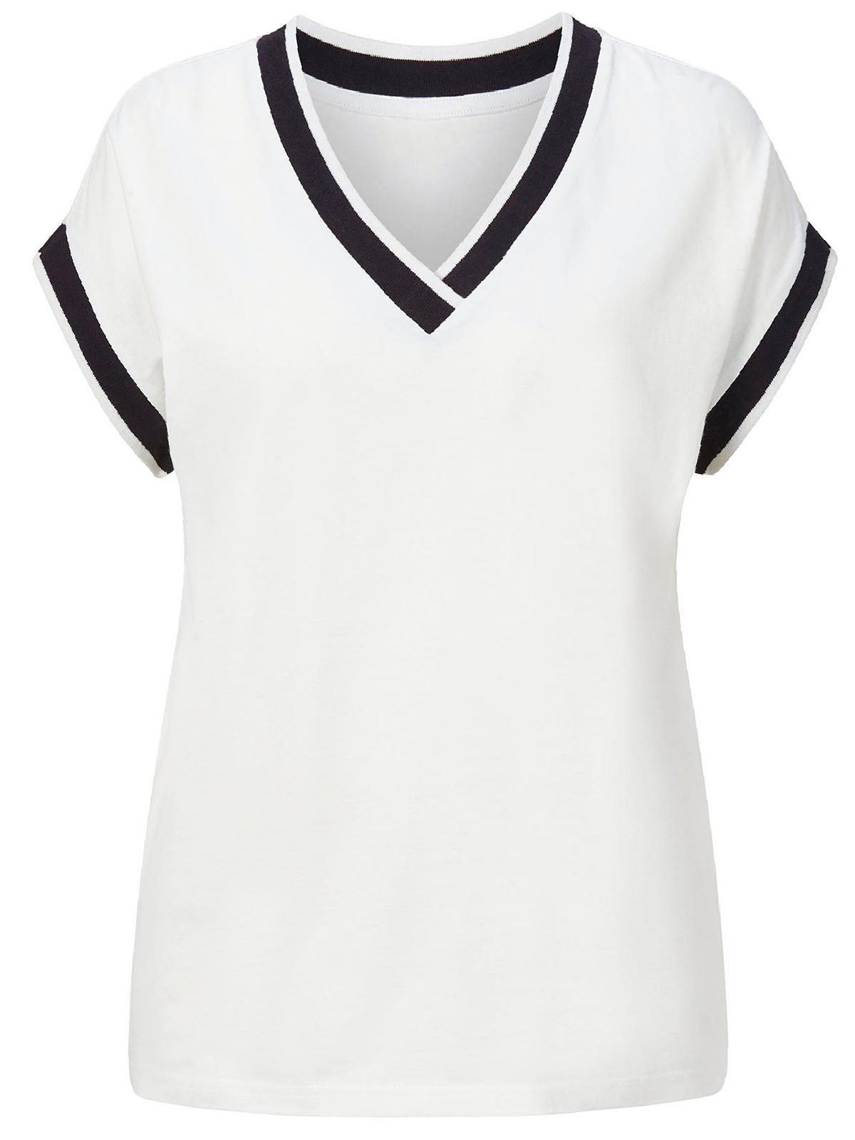 Comfort and style come together in this top. Made from a soft cotton fabric, this top is perfect for everyday wear. Its short length sleeves and v-neck provide a flattering fit, while the bold contrast trim adds a touch of personality.