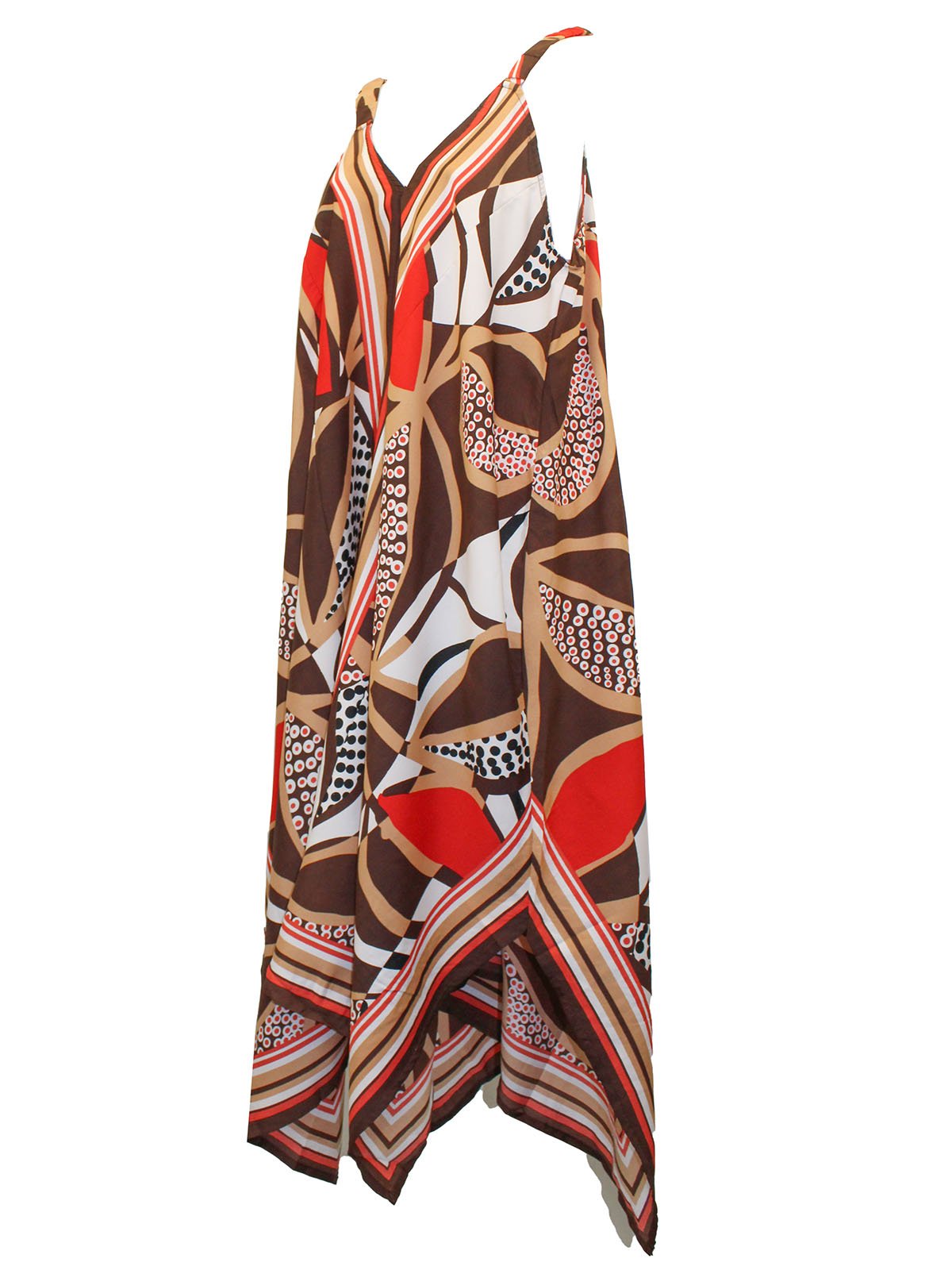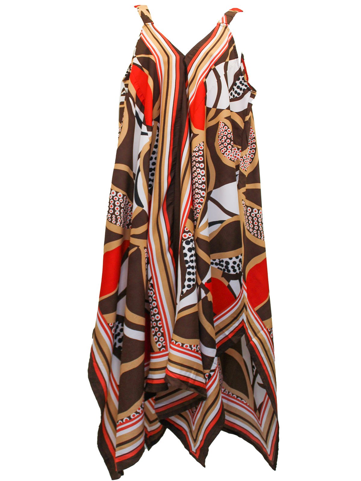 An eye-catching sleeveless dress with a timeless scarf print. Styled with a v-neckline and a hanky hem.
