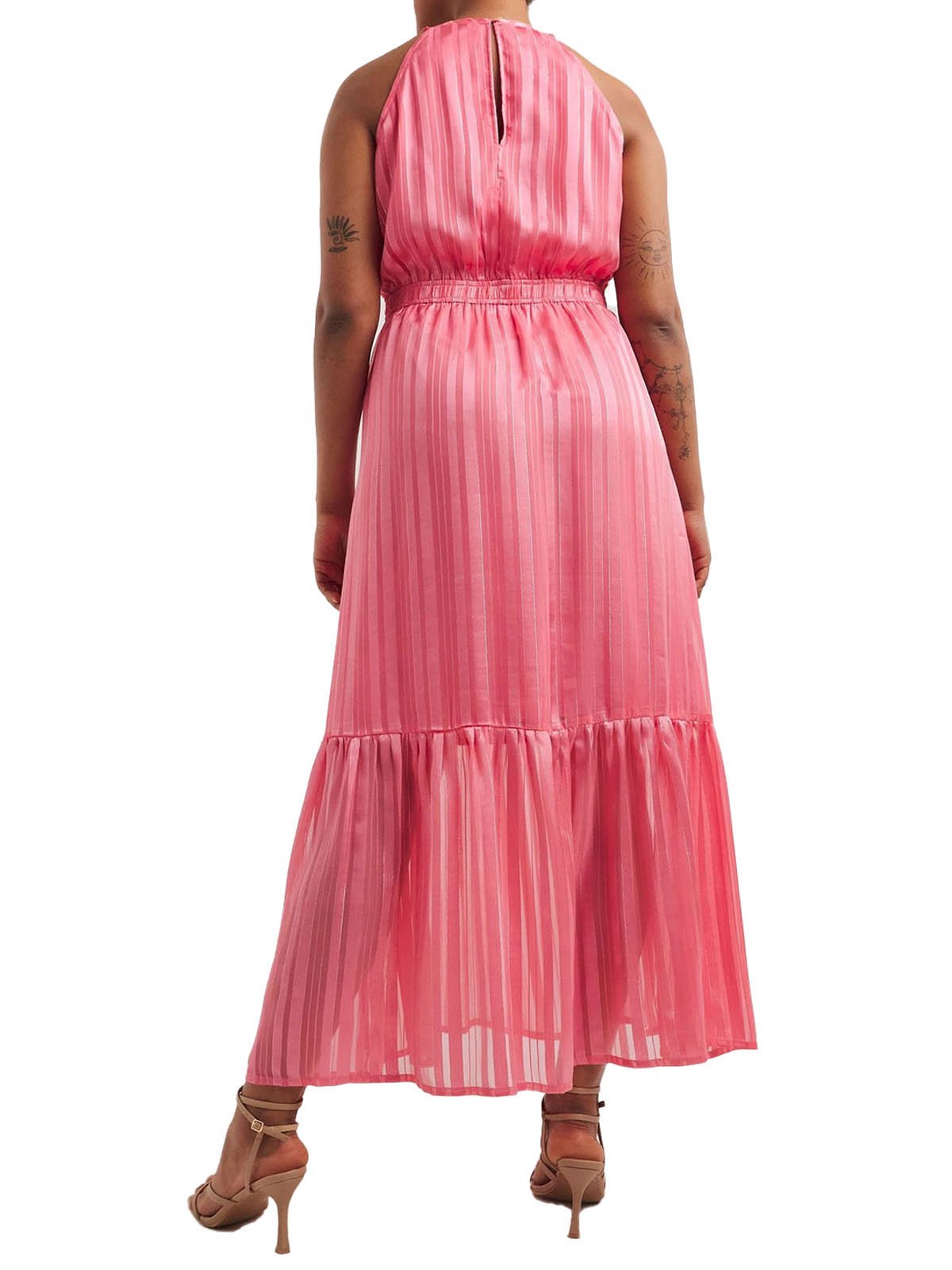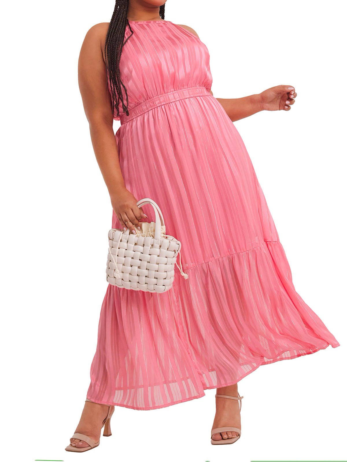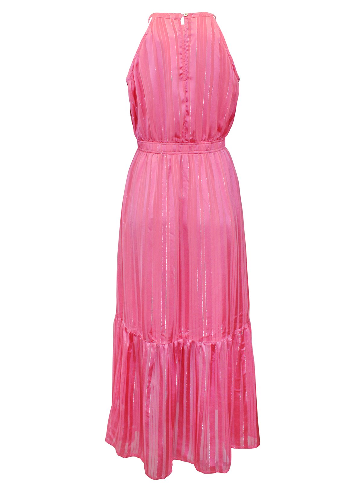 This gorgeous maxi will be perfect for your upcoming occasions. In a stunning pink lurex, this dress features a tie waist and halterneck design.